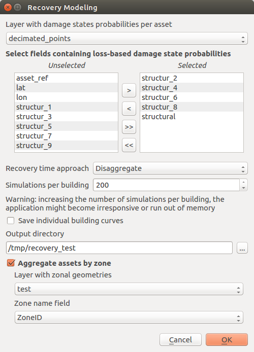 Initially, the user must select the layer containing the information regarding the damage state probabilities per asset (see Preparation of the input files for the OpenQuake Engine analysis), after which the specific fields that contain these probabilities shall be opted. Next, the user must select a specific recovery time approach (Aggregate/Disaggregate) and set the number of simulations per building (number of damage realizations used in Monte Carlo Simulation). Here, it is possible to select the layer of the study area with zonal geometries and generate aggregated recovery curves by zones.